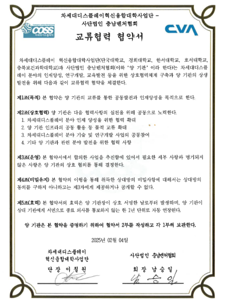 2025년 02월 04일 차세대디스플레이 혁신융합대학사업단(단장 이칠원)과 사단법인 충남벤처협회(회장 남승일)간 교류협력 협약서을 체결하였습니다.