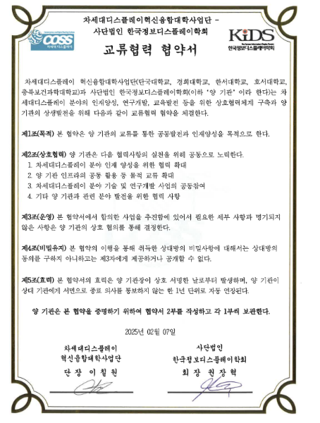 2025년 02월 07일 차세대디스플레이 혁신융합대학사업단(단장 이칠원)과 사단법인 한국정보디스플레이학회(회장 권장혁)간 교류협력 협약서을 체결하였습니다.